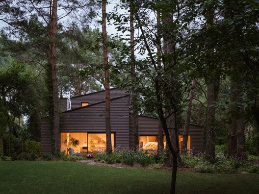The main idea behind the house design was to fit an extensive functional program into a long plot bordering the Wielkopolska National Park while maximizing daylight in as many living spaces as possible. This resulted in an elongated form composed of three overlapping, truncated volumes. An equally important goal was dividing the house into lifestyle-based zones so that, despite its size, it would not dominate the surrounding development. Through careful layout and use of local conditions, the house blends naturally into its context.